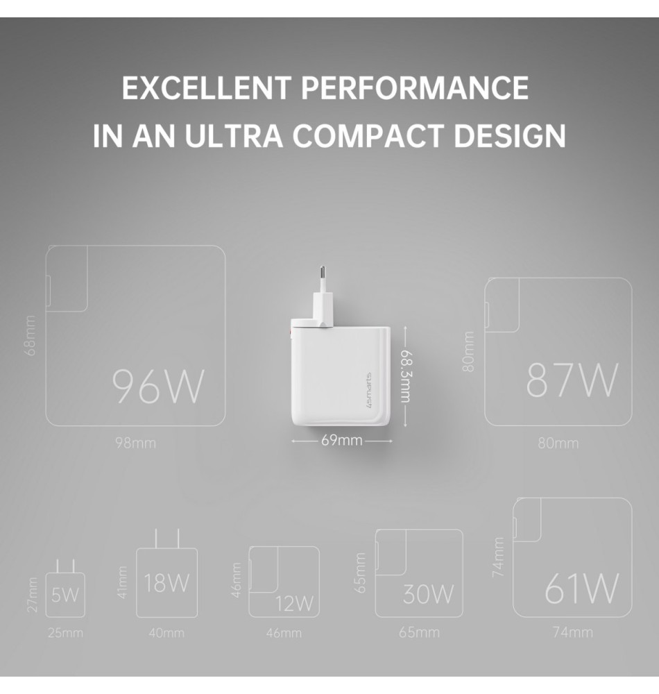 - Klein en compact: Dankzij de nieuwste technologie is deze oplader aanzienlijk kleiner dan concurrerende producten met dezelfde sterkte. Het is de perfecte metgezel voor onderweg.